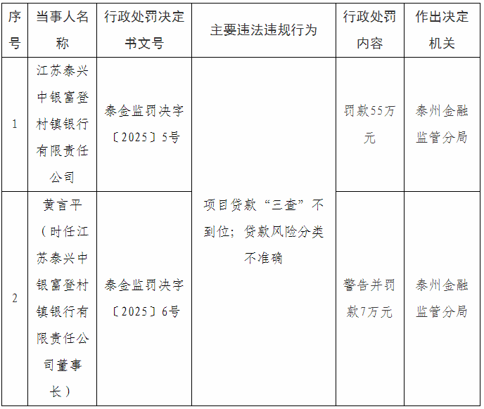 江苏泰兴中银富登村镇银行有限责任公司因项目贷款“三查”不到位、贷款风险分类不准确的主要违法违规行为,被泰州金融监管分局罚款55万元。