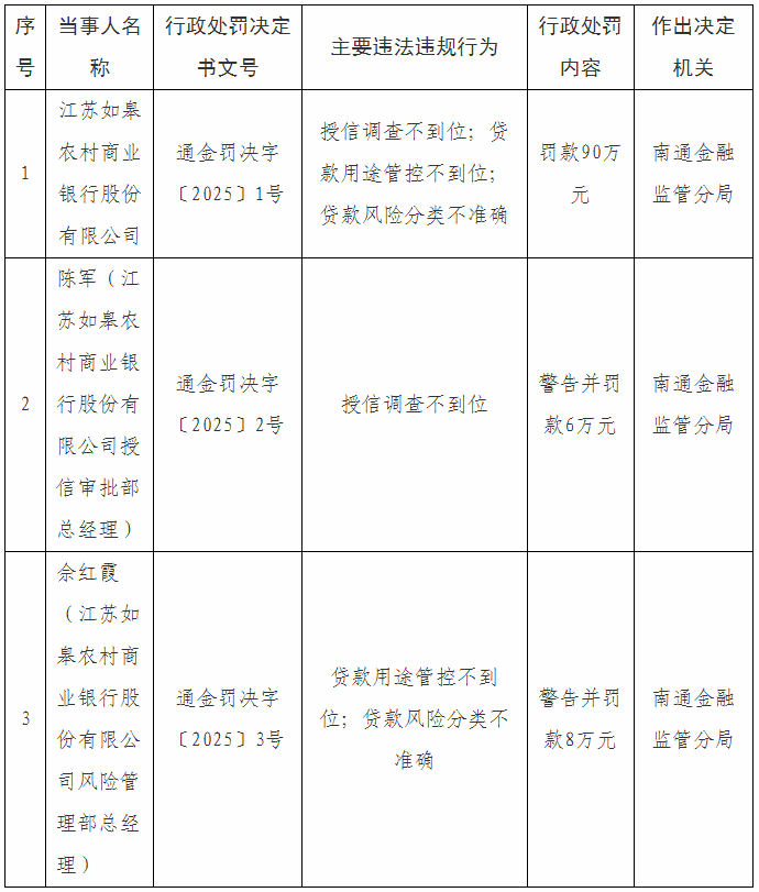 江苏如皋农村商业银行股份有限公司因授信调查不到位、贷款用途管控不到位、贷款风险分类不准确的主要违法违规行为,被南通金融监管分局罚款90万元。